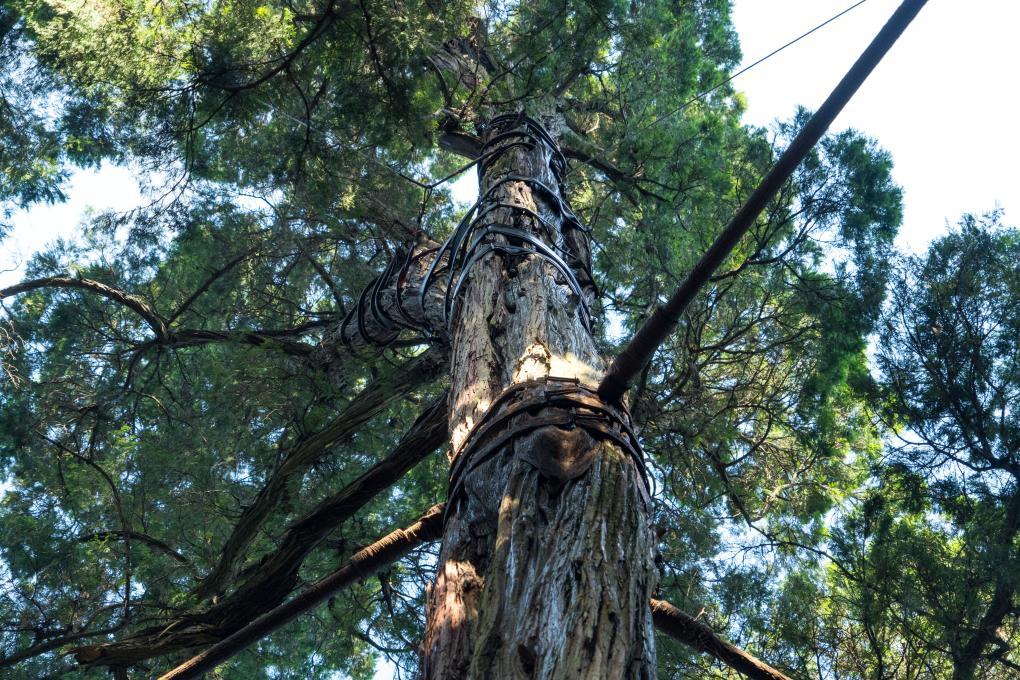 2024年8月12日在剑阁县翠云廊拍摄的古树“马甲”,在树干中部安装碳纤维加固“马甲”,与周边树木通过硬支护进行弹性连接,可以有效保障树体安全稳固。新华社记者 唐文豪 摄