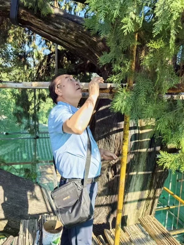 2024年6月,康永祥教授在观察保生柏新枝萌发情况。(受访者供图)