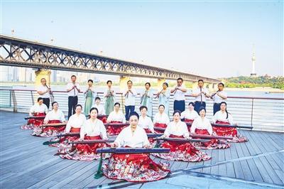 9月28日清晨,在武汉武昌区中华路城市阳台,来自武昌区老年大学、汉阳区老年大学的30余名古琴学员集体演奏《满江红》《歌唱祖国》等曲目,吸引大批市民观看。 (湖北日报全媒记者 何宇欣 通讯员 邵龙 摄)