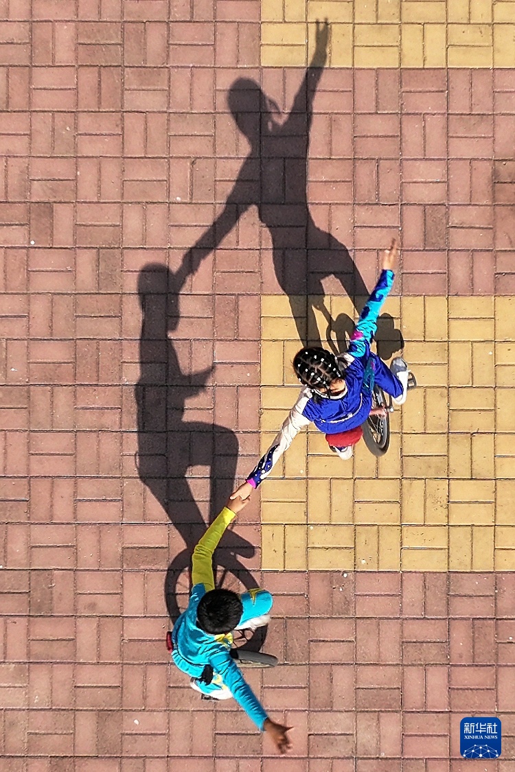 2023年10月18日,杂技学员在河北省沧州市吴桥县于集镇东街一特色杂技小院练习杂技(无人机照片)。新华社记者 骆学峰 摄