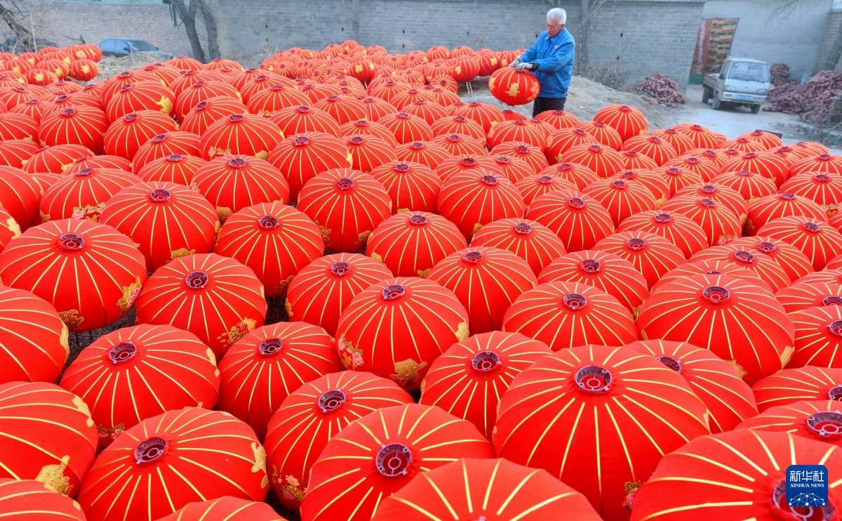 2016年1月17日,石家庄市藁城区屯头村一家宫灯生产企业的工人在摆放宫灯。新华社记者 王晓 摄
