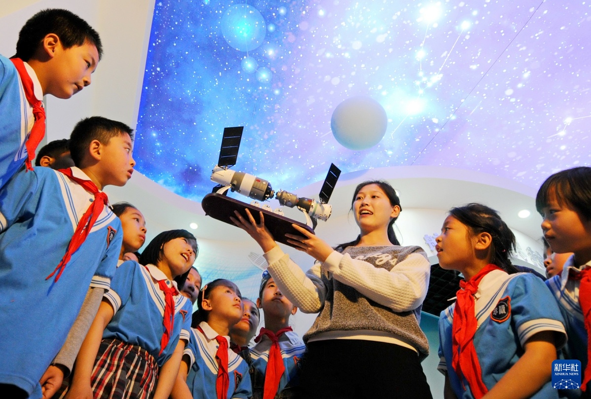 2016年4月24日是首个“中国航天日”,河北邢台一所学校的老师在“航天梦 中国梦”航天日主题科普系列活动上为同学们讲解航天知识。新华社记者 朱旭东 摄