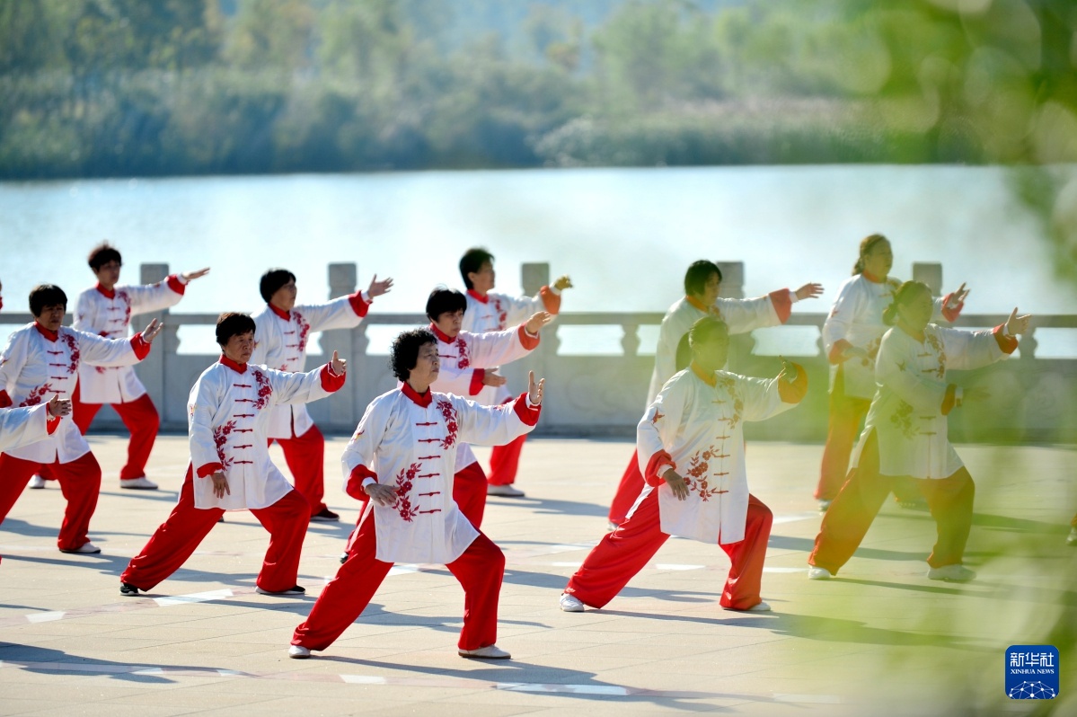 2022年10月11日,健身爱好者在河北省新河县南湖公园练习太极拳。新华社记者 王晓 摄
