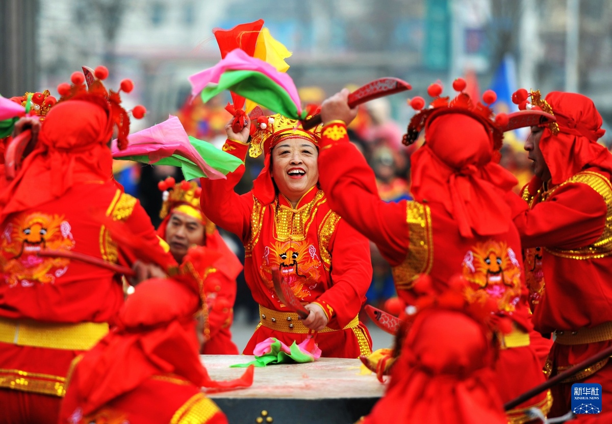 2017年2月6日,一支战鼓队在正定县鼓王争霸赛上表演。新华社记者 王晓 摄