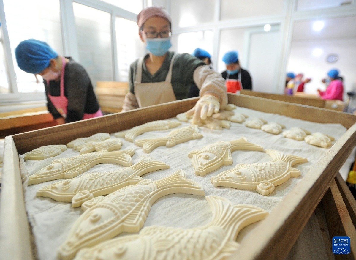 2019年1月31日,河北黄骅市一家面花作坊的工人在制作面花。新华社记者 牟宇 摄