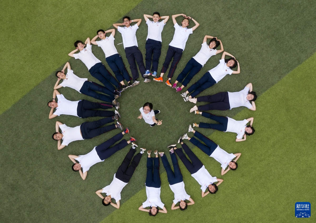 2020年6月9日,河北省衡水市一所中学的学生在操场上参加趣味游戏(无人机照片)。新华社记者 朱旭东 摄