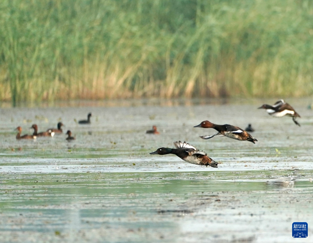 2022年7月22日,在白洋淀淀区拍摄的青头潜鸭与白眼潜鸭混群。新华社记者 邢广利 摄