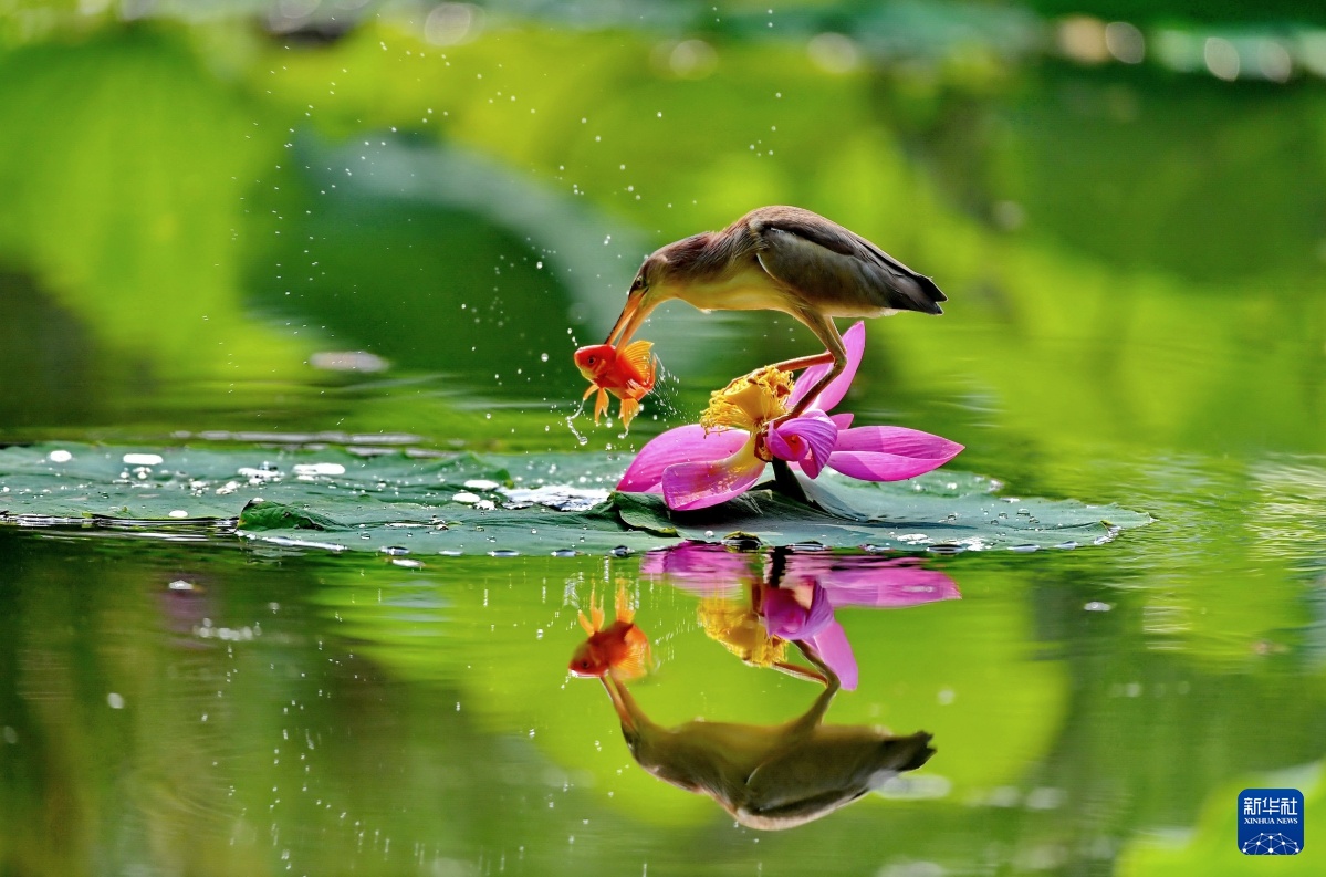 2019年7月15日,一只水鸟在河北唐山市南湖公园的荷塘抓鱼。新华社记者 杨世尧 摄