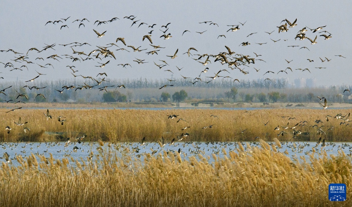 2017年11月24日,大批迁徙候鸟在衡水湖国家级自然保护区湿地飞舞。新华社记者 朱旭东 摄