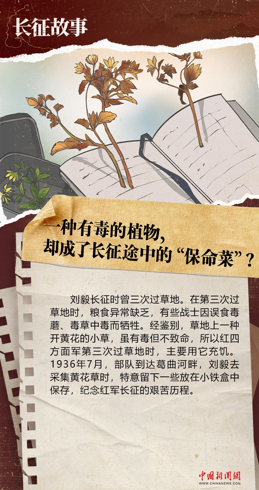 刘毅长征时曾三次过草地。在第三次过草地时,粮食异常缺乏,有些战士因误食毒蘑、毒草中毒而牺牲。经鉴别,草地上一种开黄花的小草,虽有毒但不致命,所以红四方面军第三次过草地时,主要用它充饥。1936年7月,部队到达葛曲河畔,刘毅去采集黄花草时,特意留下一些放在小铁盒中保存,纪念红军长征的艰苦历程。