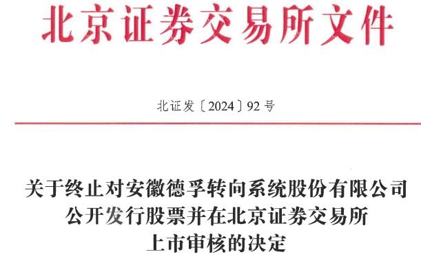 北交所于2023年6月29日受理了德孚转向提交的公开发行相关申请文件,并按照规定进行了审核。2024年8月20日,德孚转向向北交所提交了《安徽德孚转向系统股份有限公司关于撤回向不特定合格投资者公开发行股票并在北京证券交易所上市申请文件的申请报告》。根据《北京证券交易所向不特定合格投资者公开发行股票并上市审核规则》第五十五条的有关规定,北交所决定终止德孚转向公开发行股票并在北京证券交易所上市的审核。