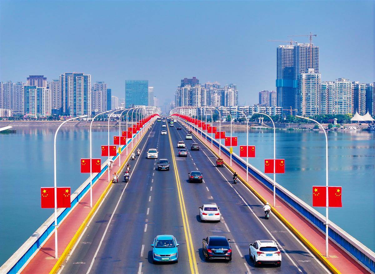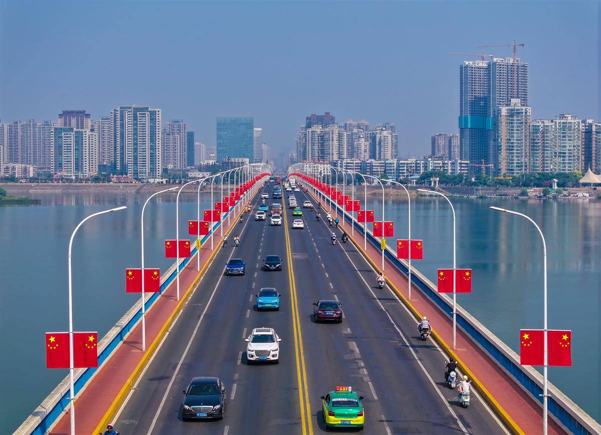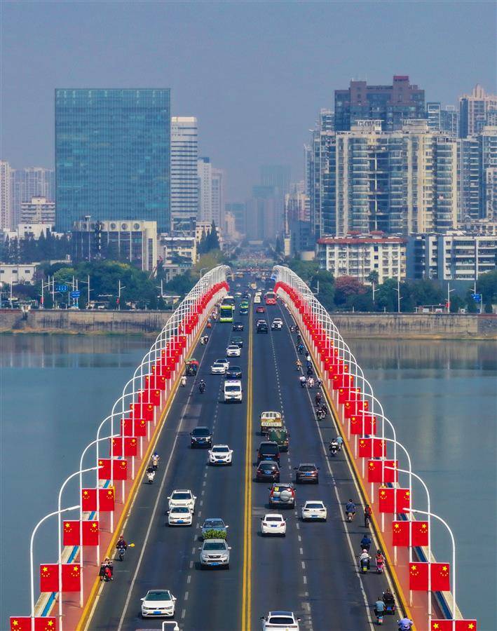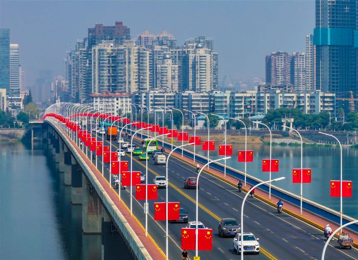 9月27日,襄阳长虹大桥上整齐悬挂着五星红旗。国庆节来临,该市主要干道、出城通道、各大桥梁、商业大街等区域,升挂近两万面五星红旗。有市民表示,每当看到“中国红”在喜庆祥和又热烈的氛围中迎风飘扬,一种民族自豪感油然而生。