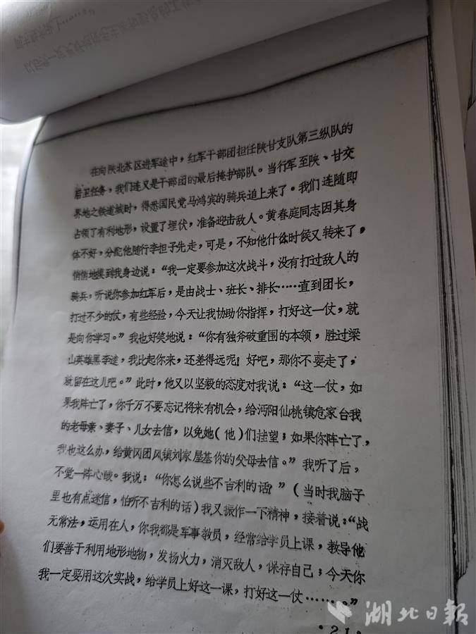 “父亲是惦记着我们的。”她翻到一页,上面写着:“此时,他(黄春庭)又以坚毅的态度对我(刘少卿)说:‘这一仗,如果我阵亡了,你千万不要忘记将来有机会,给我的老母亲、妻子、儿女去信,以免他们挂望;如果你阵亡了,我也这么办,给你的父母去信……’”