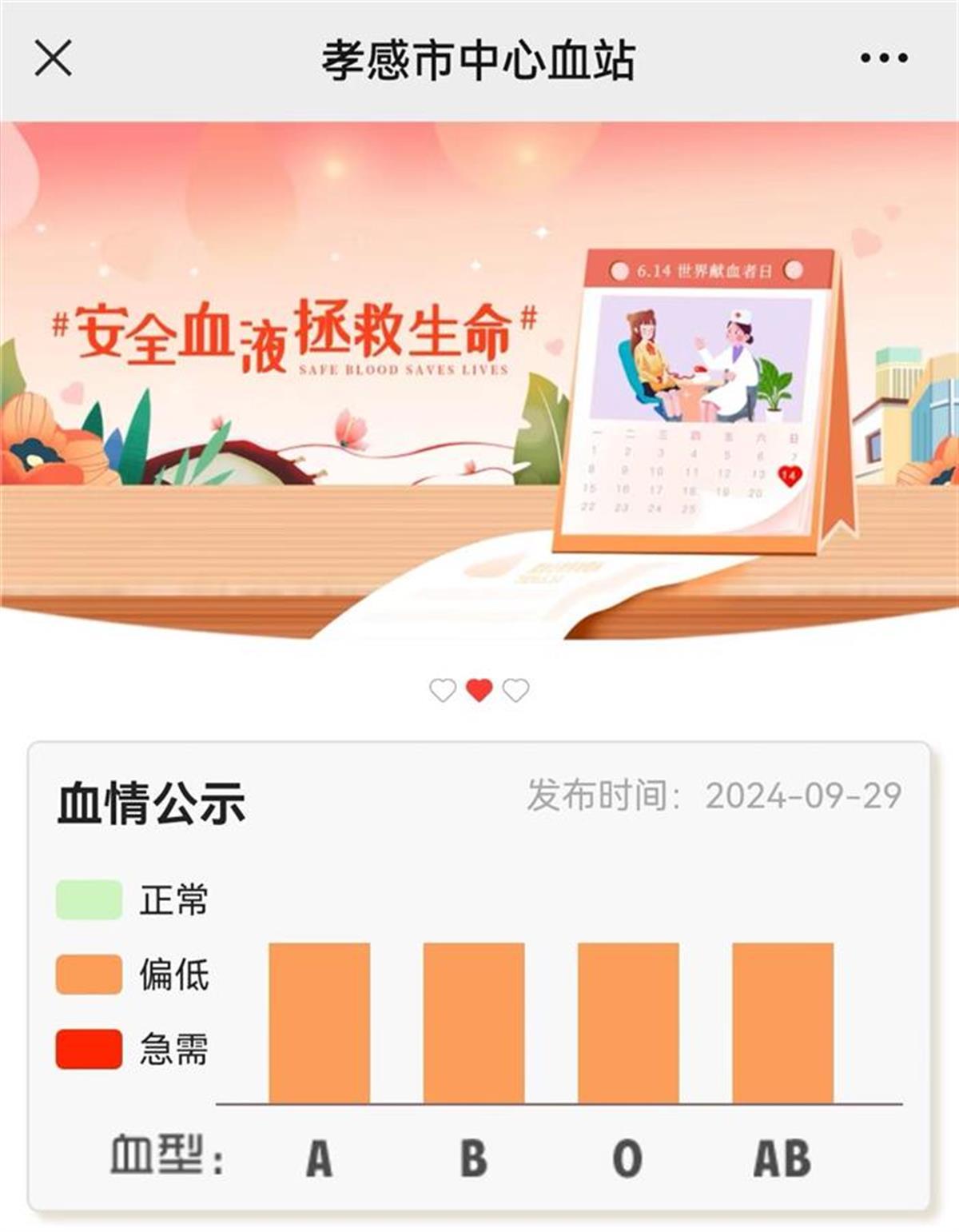 极目新闻记者了解到,孝感市中心血站9月29日的血情公示显示,A型、B型、0型、AB型血液库存均偏低。