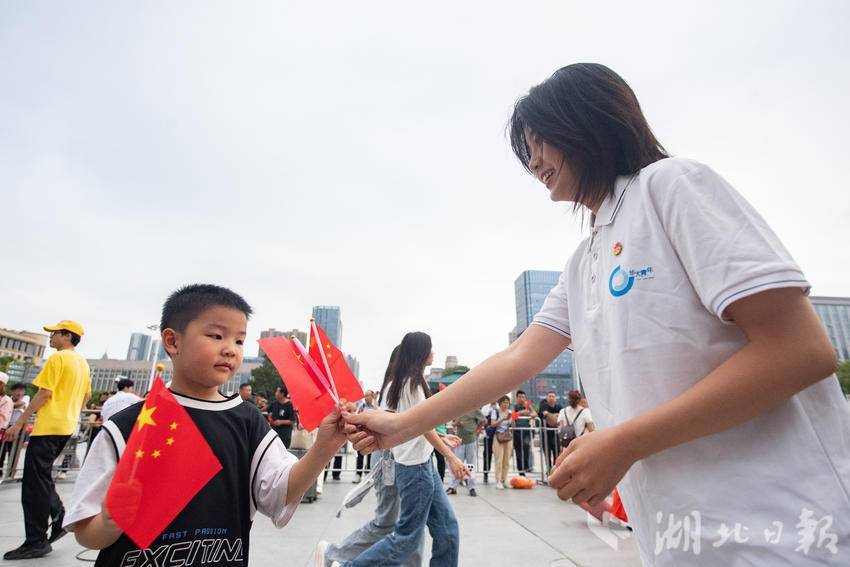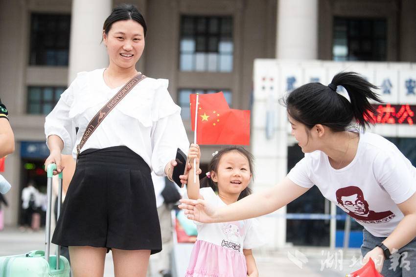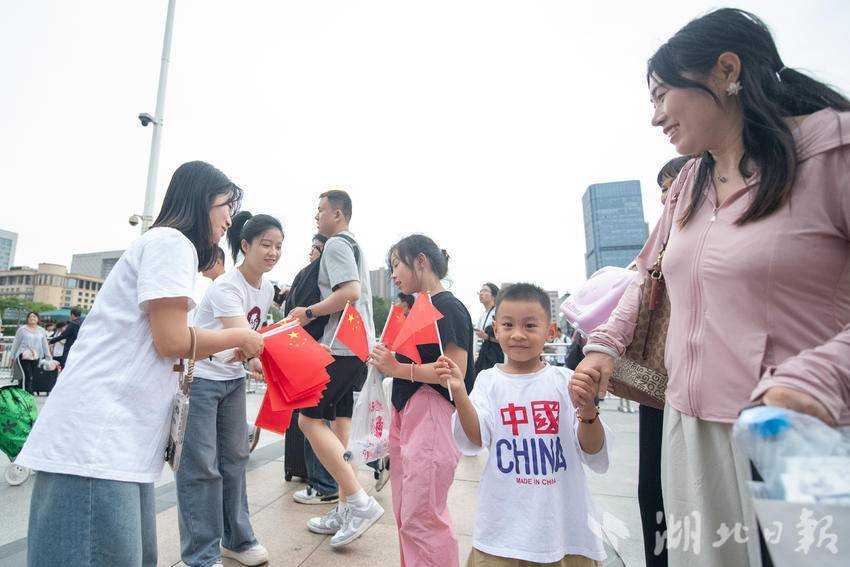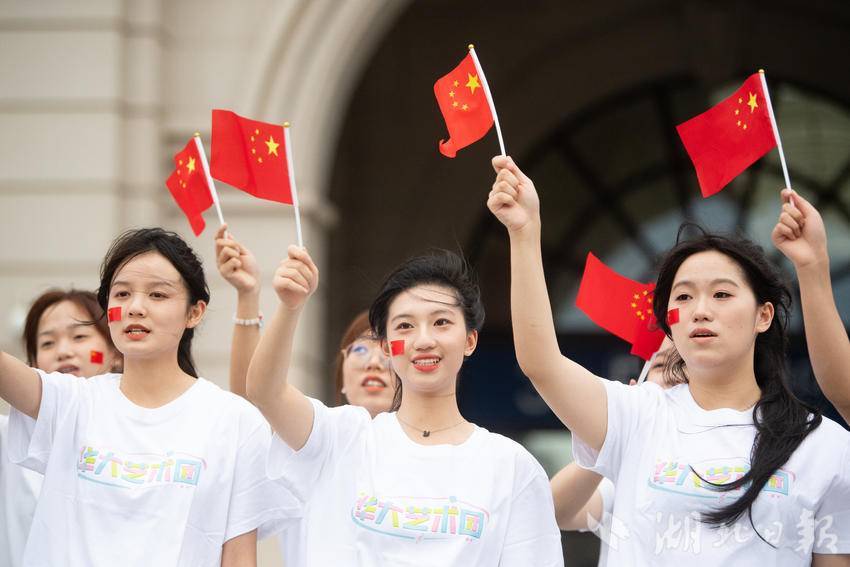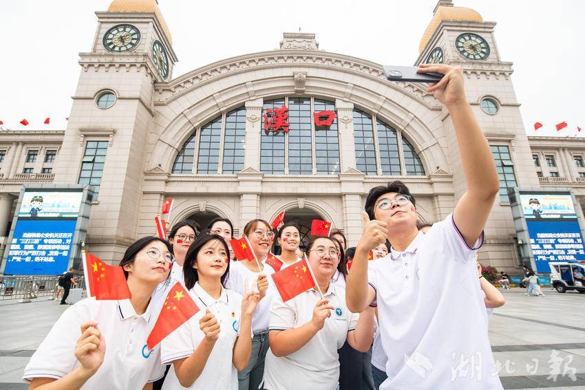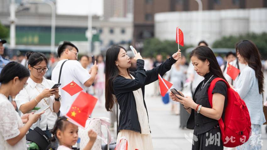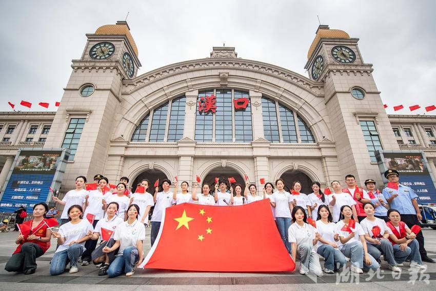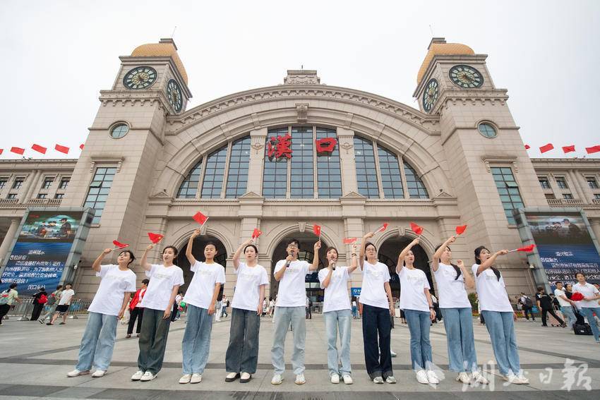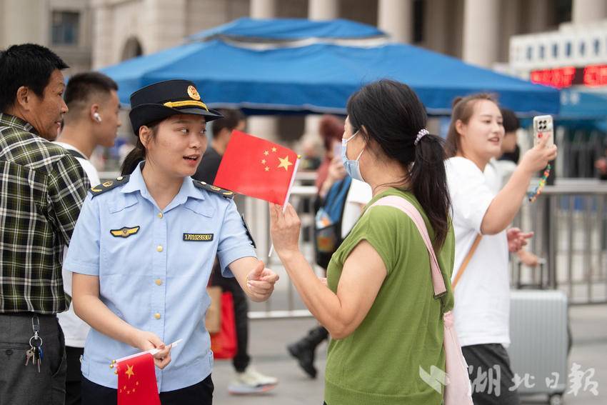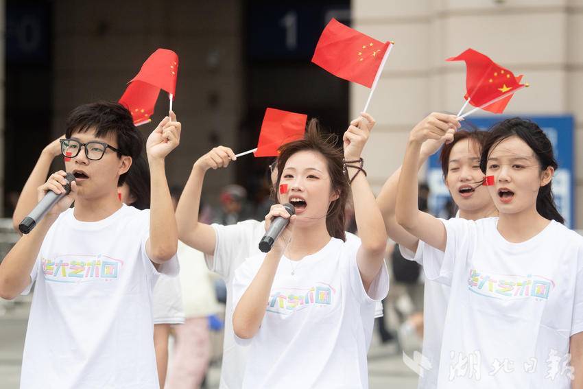 9月30日下午,在武汉汉口火车站南广场,一场由华中师范大学联合江汉区汉口站综管办举办的合唱快闪活动,吸引大批旅客驻足观看。《红旗飘飘》《歌唱祖国》……一首首脍炙人口的歌曲响彻广场,华中师范大学的学生们与汉口站综管办工作人员一道用嘹亮的歌声祝福祖国生日快乐!此外,学生们与工作人员还一同在广场上为过路旅客免费发放国旗,转眼间汉口站南广场上红旗飘飘,大家纷纷挥舞手中的国旗打卡拍照,在祖国母亲75岁生日到来之际,留下珍贵难忘的瞬间。(湖北日报全媒记者 何宇欣 通讯员 陈新琳 卢俊霖 摄)