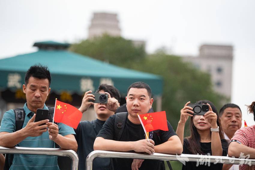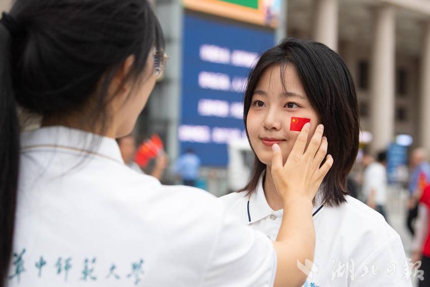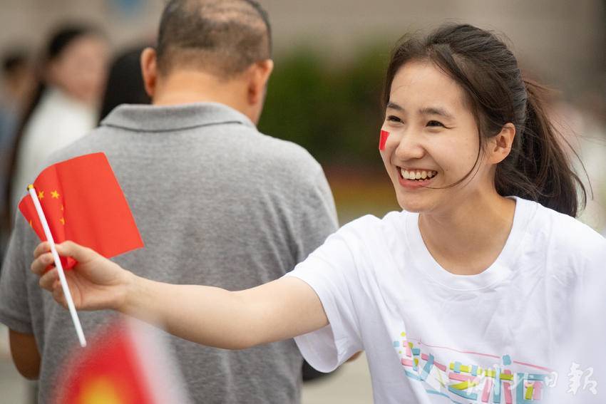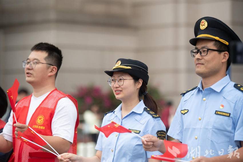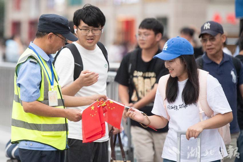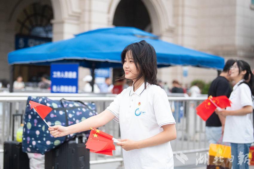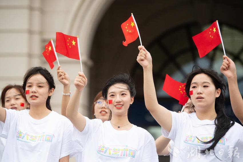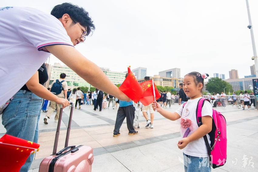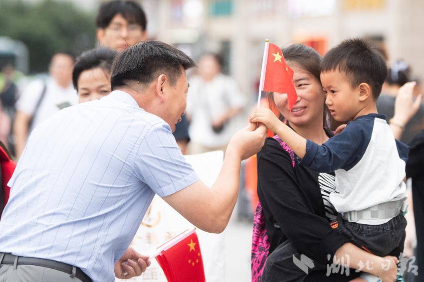 9月30日下午,在武汉汉口火车站南广场,一场由华中师范大学联合江汉区汉口站综管办举办的合唱快闪活动,吸引大批旅客驻足观看。《红旗飘飘》《歌唱祖国》……一首首脍炙人口的歌曲响彻广场,华中师范大学的学生们与汉口站综管办工作人员一道用嘹亮的歌声祝福祖国生日快乐!此外,学生们与工作人员还一同在广场上为过路旅客免费发放国旗,转眼间汉口站南广场上红旗飘飘,大家纷纷挥舞手中的国旗打卡拍照,在祖国母亲75岁生日到来之际,留下珍贵难忘的瞬间。(湖北日报全媒记者 何宇欣 通讯员 陈新琳 卢俊霖 摄)