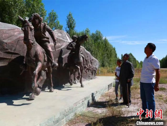 胡拥军空闲时会带着儿子陪同父亲到雕像前看看。该铜雕根据真人真事创作,领路人是胡拥军的父亲胡达拜尔干。受访者供图