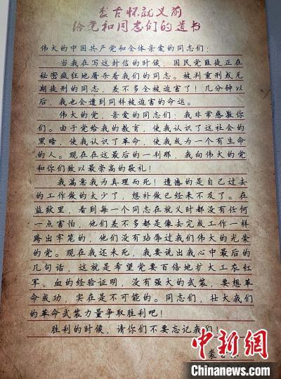 裘古怀就义前写给党和同志们的遗书。 林波 摄