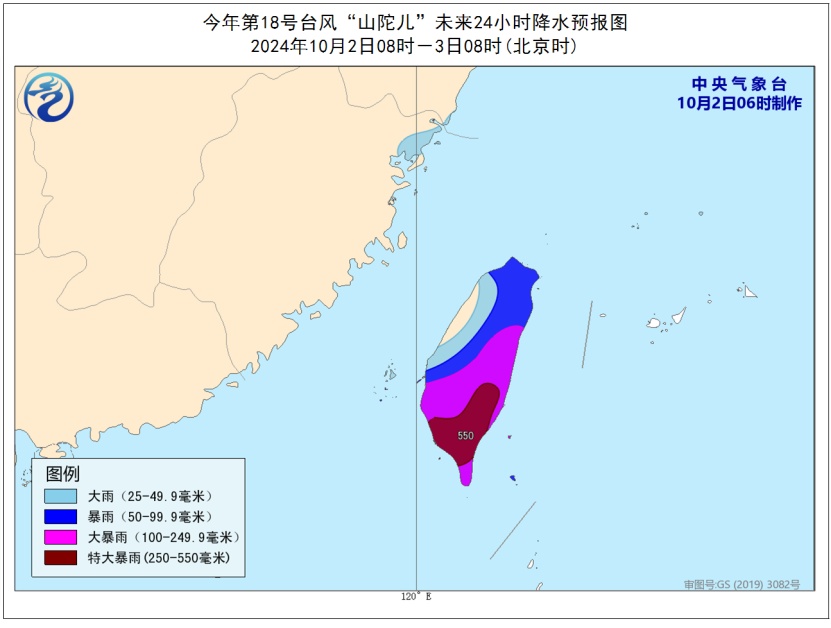 降水预报:10月2日08时至3日08时,福建东北部、台湾岛大部有大到暴雨,其中,台湾岛东部和南部部分地区有大暴雨,台湾岛南部局地有特大暴雨(250-550毫米)。