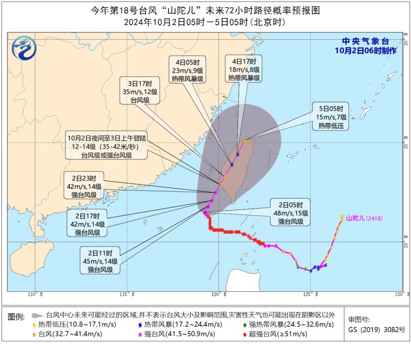 预计,“山陀儿”将以每小时5-10公里的速度向北偏东方向缓慢移动,强度逐渐减弱,将于10月2日夜间至3日上午在台湾岛西南部沿海登陆(台风级或强台风级,12-14级,35-42米/秒),自南向北穿过台湾岛,强度明显减弱。