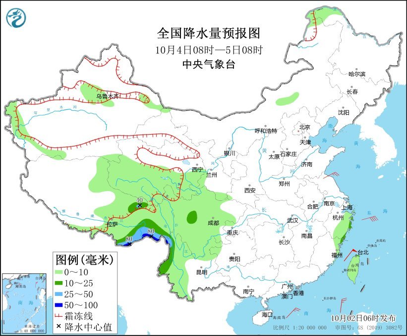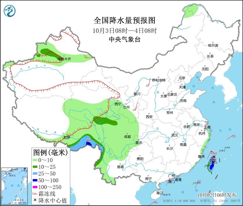 10月3日08时至4日08时,新疆沿天山地区和伊犁河谷、西藏东南部、青海南部、川西高原北部、云南西北部、台湾岛等地部分地区有中到大雨,其中,西藏东南部、台湾岛中东部等地部分地区有暴雨或大暴雨(100~180毫米)。新疆北部、内蒙古西部、甘肃东部等地部分地区有5~6级、阵风7~8级的大风;浙江沿海、福建沿海、台湾岛沿海、东海北部海域、巴士海峡北部将有7~8级、阵风9~10级的大风,东海南部海域、台湾海峡、台湾以东洋面、南海东北部偏北海域将有9~10级、阵风11~12级的大风。
