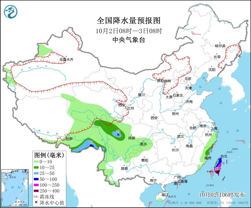 10月2日08时至3日08时,西藏东南部和东北部、青海南部、川西高原、云南西北部、浙江东南部、福建东北部、台湾岛大部等地部分地区有中到大雨,其中,西藏东南部、台湾岛中东部和南部等地部分地区有暴雨或大暴雨,台湾岛南部局地有特大暴雨(250~550毫米)。浙江沿海、福建沿海、台湾岛沿海等地部分地区有6~7级,阵风8~9级的大风。