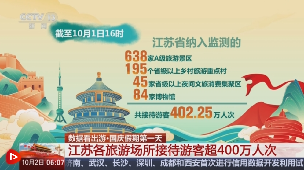 据江苏智慧文旅平台监测,国庆假期第一天截至下午4时,全省纳入监测的638家A级旅游景区、195个省级以上乡村旅游重点村、45家省级以上夜间文旅消费集聚区和84家博物馆共接待游客402.25万人次。