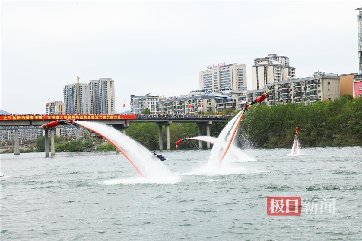 此次水上极限表演秀分有无人机国旗表演秀、国旗飘扬与快艇特技表演、空中飞人与坐式摩托艇特技表演、水上冲浪立式花样摩托艇特技表演、水上金字塔快艇特技表演等项目,在竹山县桃花埠码头至堵河三桥水域开展为期两天的表演。