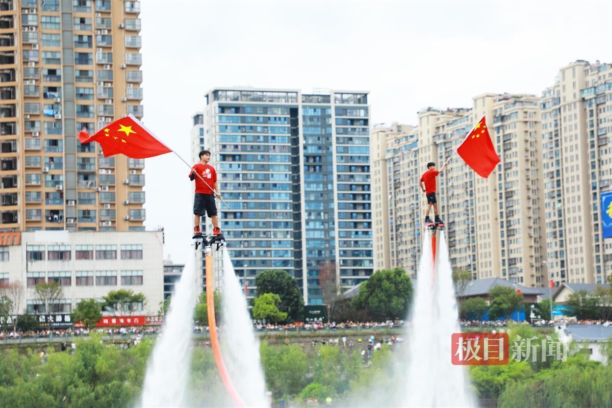 随着一阵摩托艇的轰鸣声,国旗迎风飘起,“水上飞人”酷炫出场,配合着空中无人机悬挂的国旗,开启了水上极限表演秀。