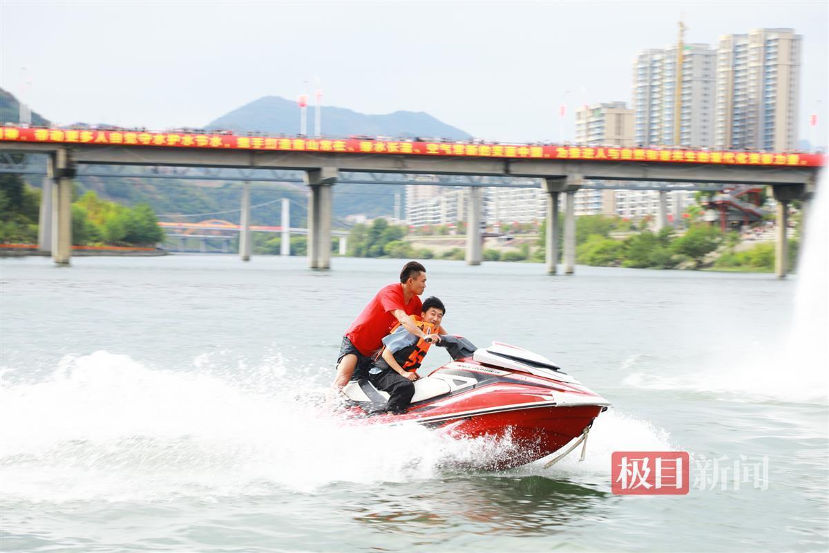 伴随着动感的音乐,水上冲浪、水上金字塔表演扣人心弦,表演者驾驶快艇或脚踏滑板,在堵河上开展立式花样摩托艇特技和水上叠金字塔表演,河面上白浪翻飞,惊心动魄,极具视觉冲击力的表演让现场观众心跳加速,尖叫连连。游客黄汐玉说:“水上表演现场非常地震撼,让我也是无比地激动,希望我们竹山多多举行类似的这种活动。”