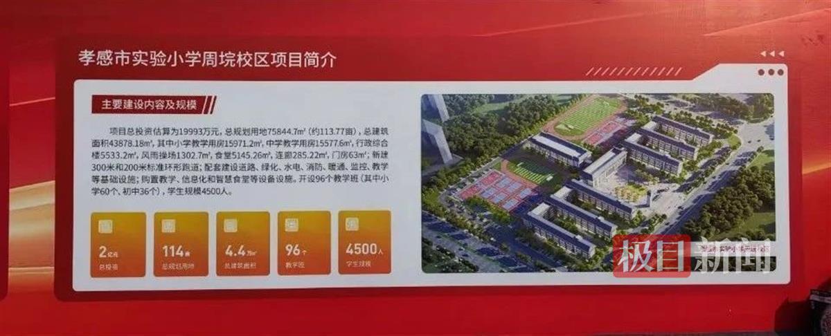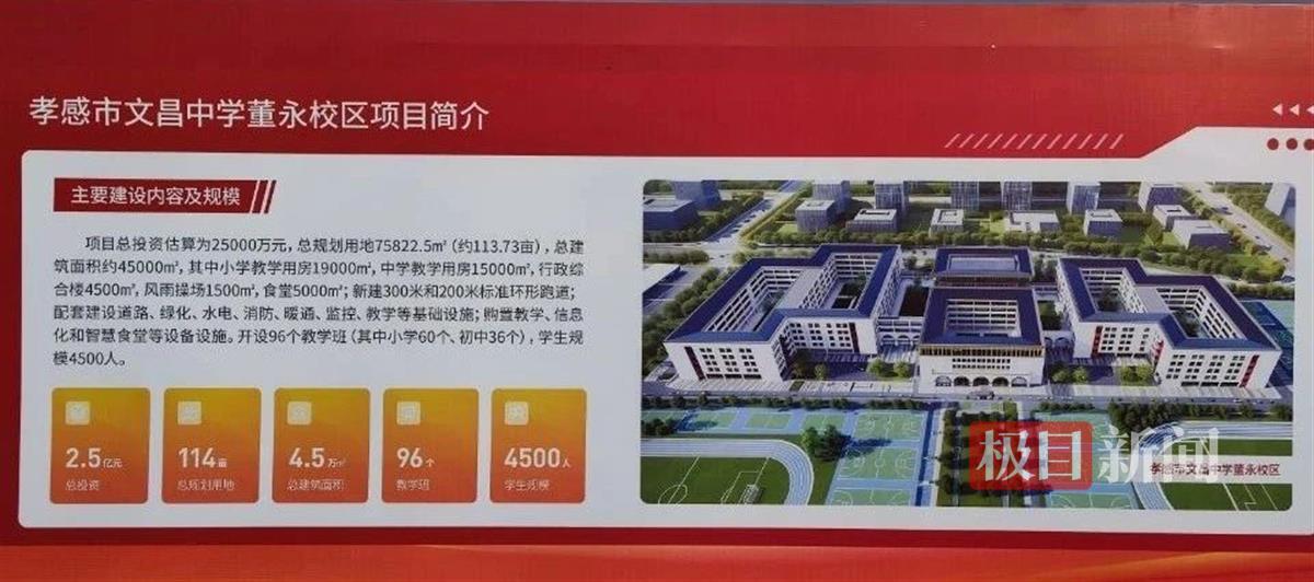 极目新闻记者了解到,这次开工建设的孝感市文昌中学教育集团董永校区位于毛陈镇,总投资约2.5亿元,规划用地114亩,总建筑面积约4.5万平方米,办学规模4500人,其中小学开设60个教学班,初中开设36个教学班。