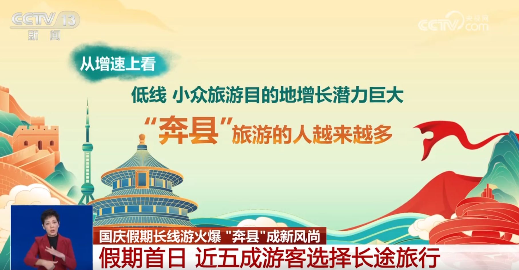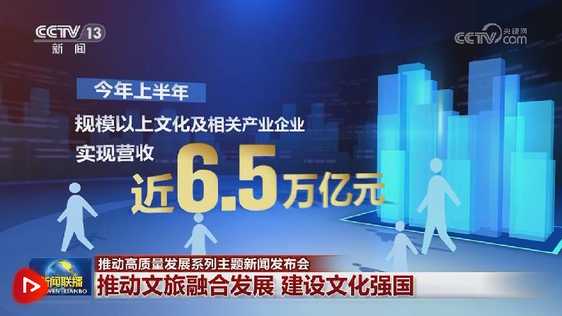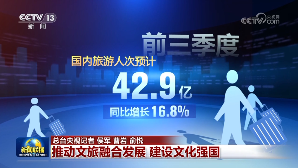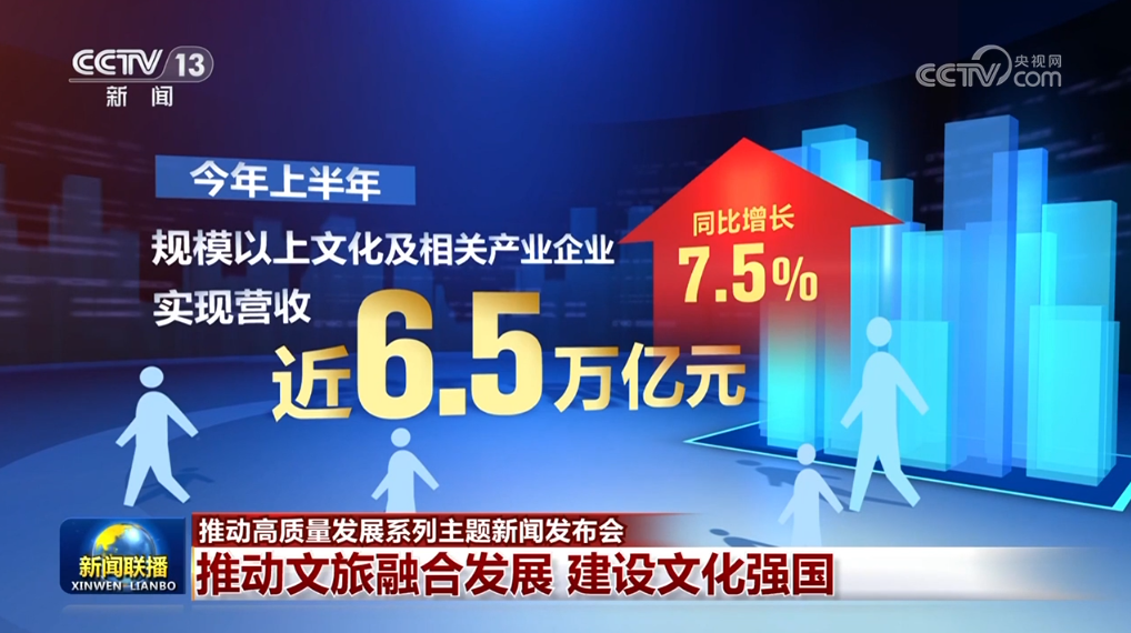 今年上半年,规模以上文化及相关产业企业实现营收近6.5万亿元,同比增长7.5%;前三季度,国内旅游人次预计达42.9亿,同比增长16.8%;入境旅游人次预计达0.95亿,同比增长55.4%,更多外国民众来华旅游,体验宾至如归、感受美好中国。