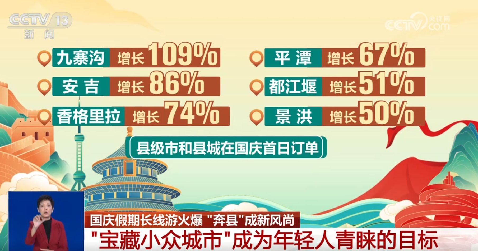 从增速上看,低线、小众旅游目的地增长潜力巨大,“奔县”旅游的人越来越多。九寨沟、安吉、香格里拉、平潭、都江堰、景洪等县级市和县城在国庆首日都分别实现订单109%、86%、74%、67%、51%、50%的增长。