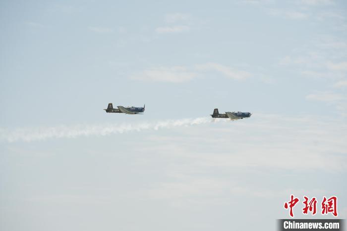 10月2日,江西南昌高新区瑶湖机场举行飞行嘉年华活动,不少市民和游客趁着假期来到这里感受航空文化。图为初教-6双机飞行表演。中新社记者 吴敏 摄