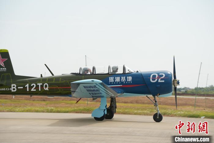 10月2日,江西南昌高新区瑶湖机场举行飞行嘉年华活动,不少市民和游客趁着假期来到这里感受航空文化。图为初教-6准备起飞。中新社记者 吴敏 摄