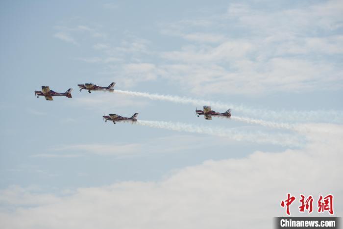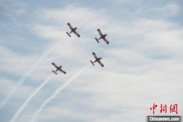 10月2日,江西南昌高新区瑶湖机场举行飞行嘉年华活动,不少市民和游客趁着假期来到这里感受航空文化。图为阿若拉编队飞行表演。中新社记者 吴敏 摄