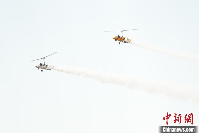 10月2日,江西南昌高新区瑶湖机场举行飞行嘉年华活动,不少市民和游客趁着假期来到这里感受航空文化。图为旋翼机双机飞行表演。中新社记者 吴敏 摄