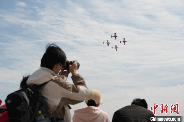 10月2日,江西南昌高新区瑶湖机场举行飞行嘉年华活动,不少市民和游客趁着假期来到这里感受航空文化。图为游客拍摄飞行表演。中新社记者 吴敏 摄