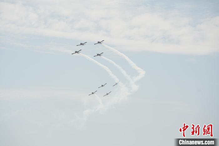 10月2日,江西南昌高新区瑶湖机场举行飞行嘉年华活动,不少市民和游客趁着假期来到这里感受航空文化。图为阿若拉8机编队飞行表演。中新社记者 吴敏 摄