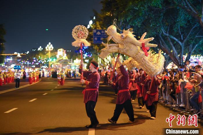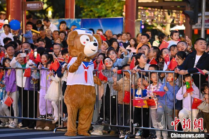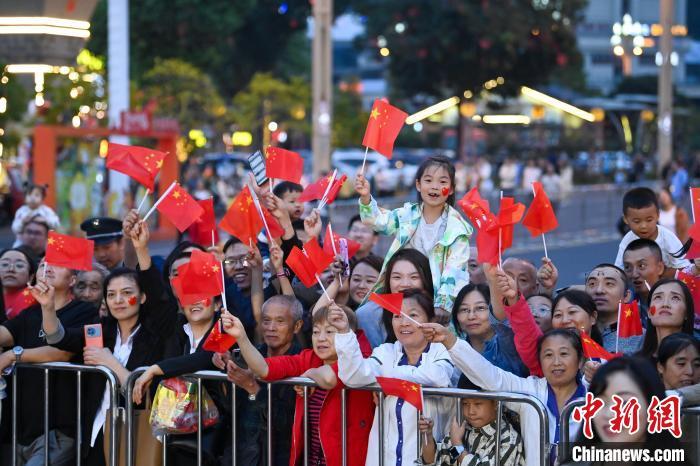 图为观看展演的游客或民众挥舞手中的小红旗为巡游助阵。中新社记者 刘忠俊 摄