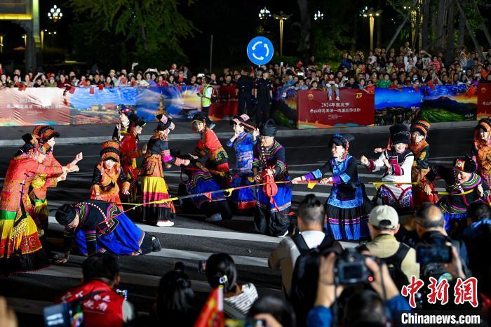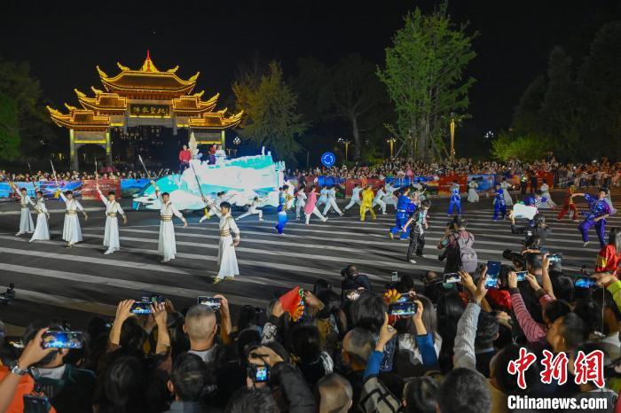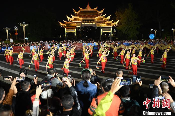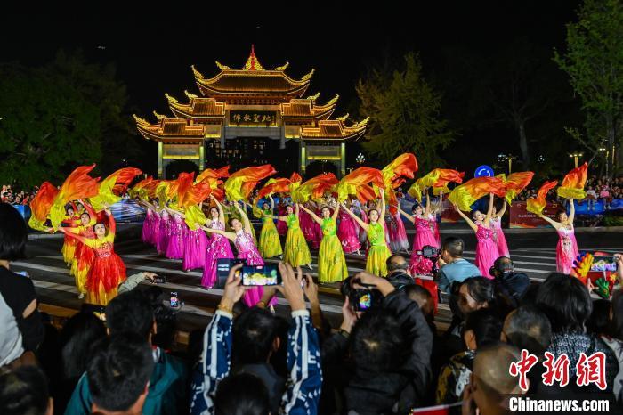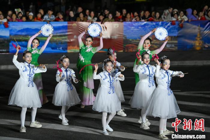 10月2日晚,四川省峨眉山市城区,一场盛大的国庆非遗展演活动精彩上演,2大主题花车、13个表演方阵和超500人的表演队伍盛装打扮、载歌载舞,现场热闹非凡。在马路桥美食街、“天下名山广场”牌坊区和仙侠云集街区等展演区,打法多样的峨眉莲箫、刚柔相济的峨眉武术等精彩节目“引爆”现场游客和民众热情,掌声、呐喊声响彻街头。图为风格独特的“峨眉莲箫”舞展演方阵的演员们边打边唱,将集舞蹈、说唱、音乐于一体的曲艺形式展现在游客和民众眼前。中新社记者 刘忠俊 摄