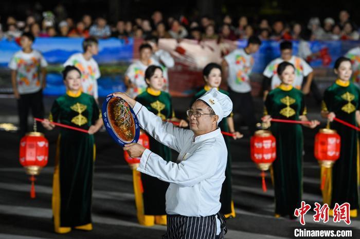 图为美食大厨等组成的美食方阵展示多姿多彩、魅力无限的嘉州美食。中新社记者 刘忠俊 摄