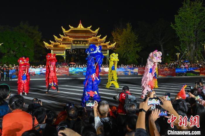 图为来自夹江的舞狮方阵正在表演。中新社记者 刘忠俊 摄