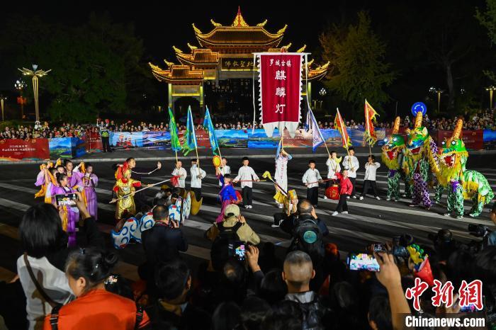 图为犍为罗城展演方阵正在表演民间灯舞——罗城麒麟灯,表演动作借鉴了传统川剧表演形式,独树一帜。中新社记者 刘忠俊 摄
