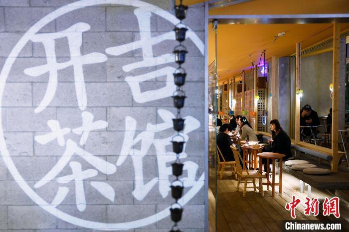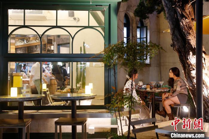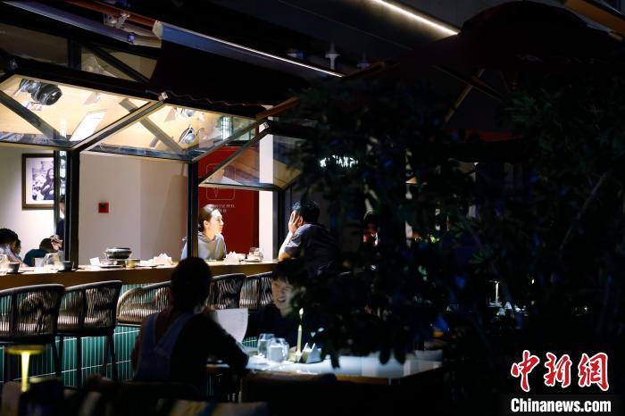 10月2日晚,民众在位于上海市长宁区延安西路1262号的上生·新所的商铺内品尝美食。中新社记者 殷立勤 摄