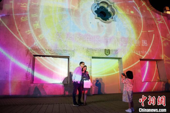 10月2日晚,市民在位于上海市长宁区延安西路1262号的上生·新所光影秀现场合影。近日,上海举办首届国际光影节,通过光影艺术激发城市活力与创新。中新社记者 殷立勤 摄
