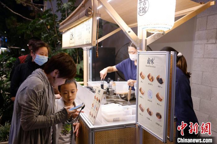 10月2日晚,市民带着孩子在位于上海市长宁区延安西路1262号的上生·新所的商铺外品尝美食。中新社记者 殷立勤 摄