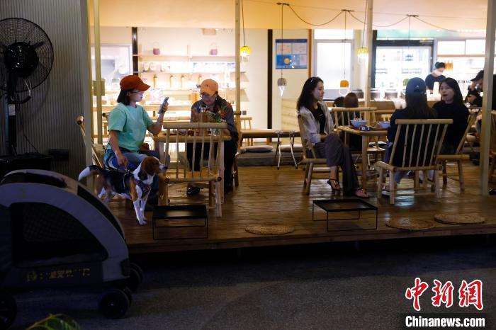 10月2日晚,民众带着宠物在位于上海市长宁区延安西路1262号的上生·新所的商铺外品尝美食。中新社记者 殷立勤 摄