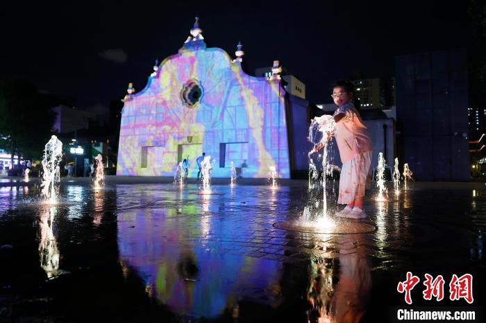 10月2日晚,孩子在位于上海市长宁区延安西路1262号的上生·新所喷水池边戏水。中新社记者 殷立勤 摄