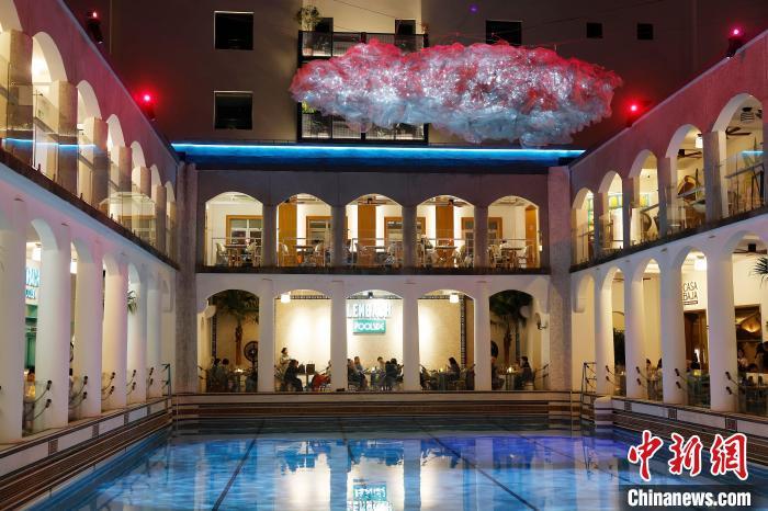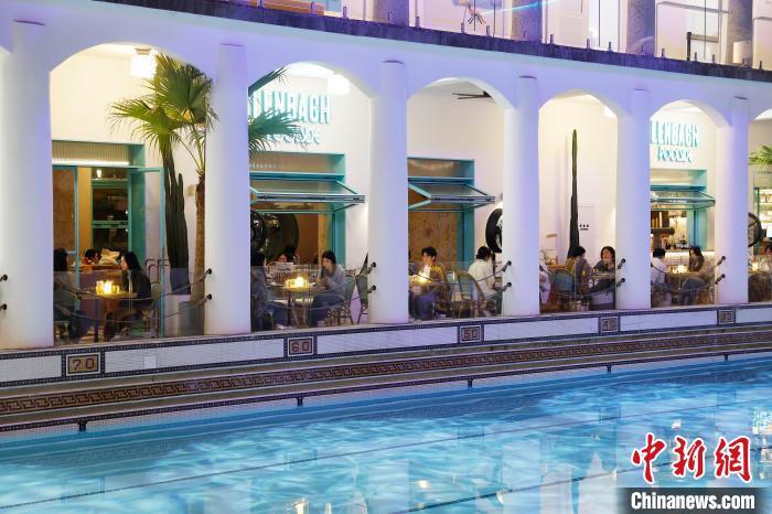 10月2日晚,民众在位于上海市长宁区延安西路1262号的上生·新所的海军俱乐部游泳池边品尝美食。中新社记者 殷立勤 摄